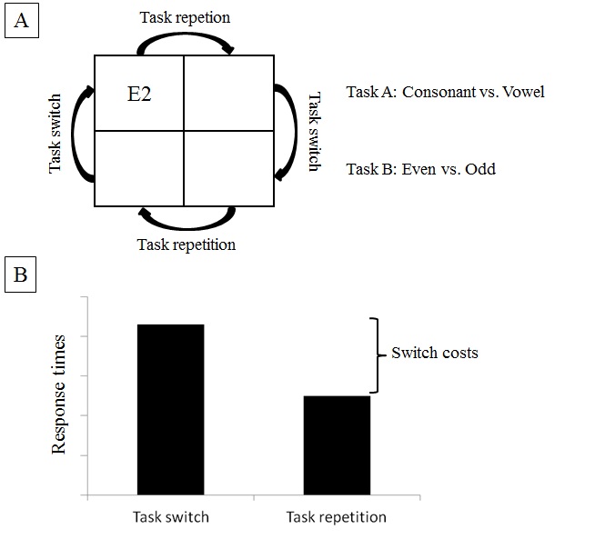 There is a good deal of support for the connection between action games and their effects on shifting between different informational inputs (Colzato, van Leeuwen, van den Wildenberg, & Hommel, 2010; Glass, Maddox, & Love, 2013; Schubert & Strobach, 2012; Strobach, Frensch, & Schubert, 2012). The investigation of the “shifting” executive function was carried out in transfer situations (i.e., situations that are different to and beyond the game context) in the experimental paradigm of task switching (Figure 1). In this paradigm, a sequence of stimuli is presented and these stimuli are allocated to different tasks. For example, participants are presented number-letter pairs in sequences. On some of these pairs participants perform a number task (Is the number of the number-letter pair odd or even?) and on other pairs they perform a letter task (Is the letter in the number-letter pair a vowel or a consonant?; Rogers & Monsell, 1995). The specific task instruction (i.e., number task or letter task) is mixed across different trials in the sequence, resulting in repetitions of the same task and shifts between the different tasks. So-called switch costs appear when comparing the performance in both situations (Figure 1). The response times are slower during the shift between tasks than during repetitions. These slower response times emerge because of the requirement to shift to a new task instead of merely repeating the same task. People with experience in action games, however, showed less switch costs than non-gamers (e.g., Strobach et al., 2012). This could be a first hint at optimized executive functions for a better shift between different information.