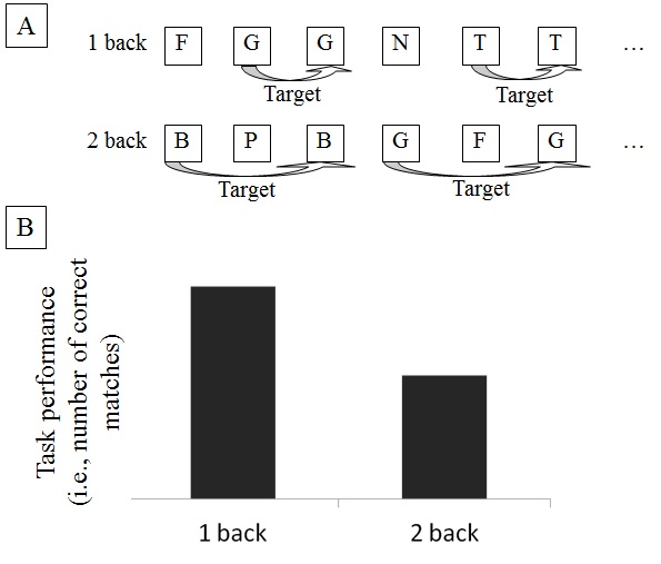 paradigm, participants are instructed to compare the current element of a sequence (e.g., a sequence with different letters) with the element n steps back (e.g., one, two or three steps). In case of a match (i.e., identical elements) they are instructed to give manual key press responses. The level of n determines the complexity level of the n-back situation and therefore the demand on the updating function. Panel (B): Typically, task performance (i.e., number of correct matches) decreases with the n level (e.g., decrease from n = 1 [1 back] to n = 2 [2 back]).