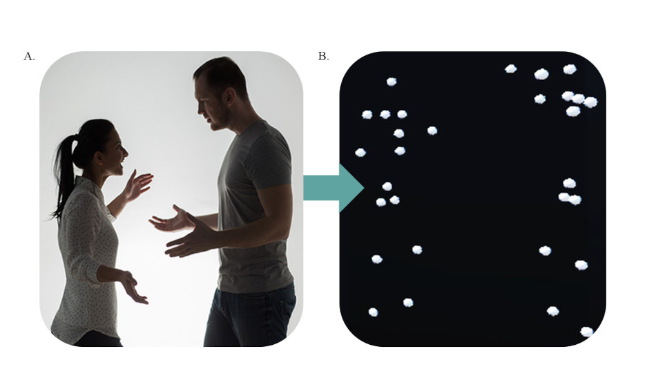 A. The left-hand figure shows two people interacting as photo or video material. B. The figure on the right shows the same interaction as a point-light display.